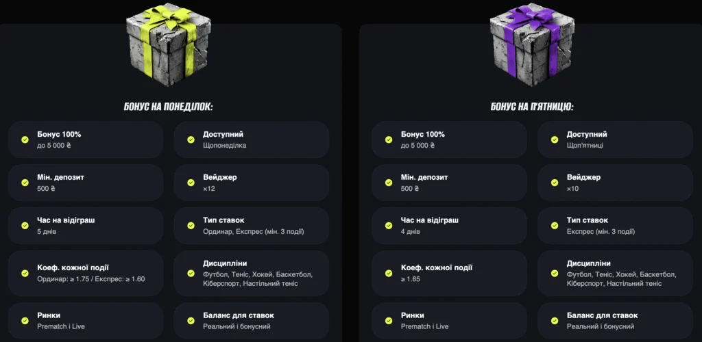 Бонусна програма регулярно оновлюється. Вся інфа в розділах Акції та Бонуси. Читай умови, прискіпливо вибирай найвигідніші подарунки й активуй. Звертай увагу на строк, вейджер, мінімальний кеф, суму депозиту. Щоби першим отримувати свіжі плюшки, підписуйся на розсилку. З купи бонусів ти завжди вибереш найкращі на свій смак. Налітай, забирай, грай і вигравай!